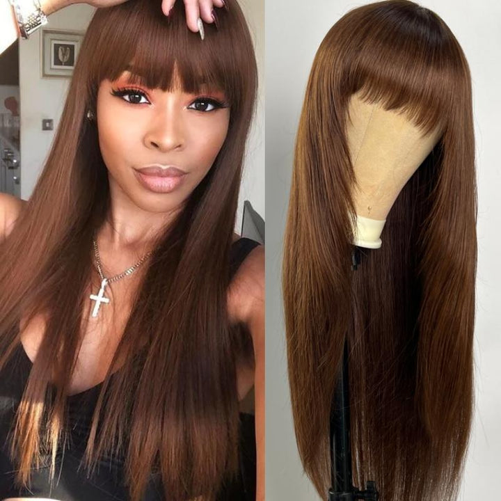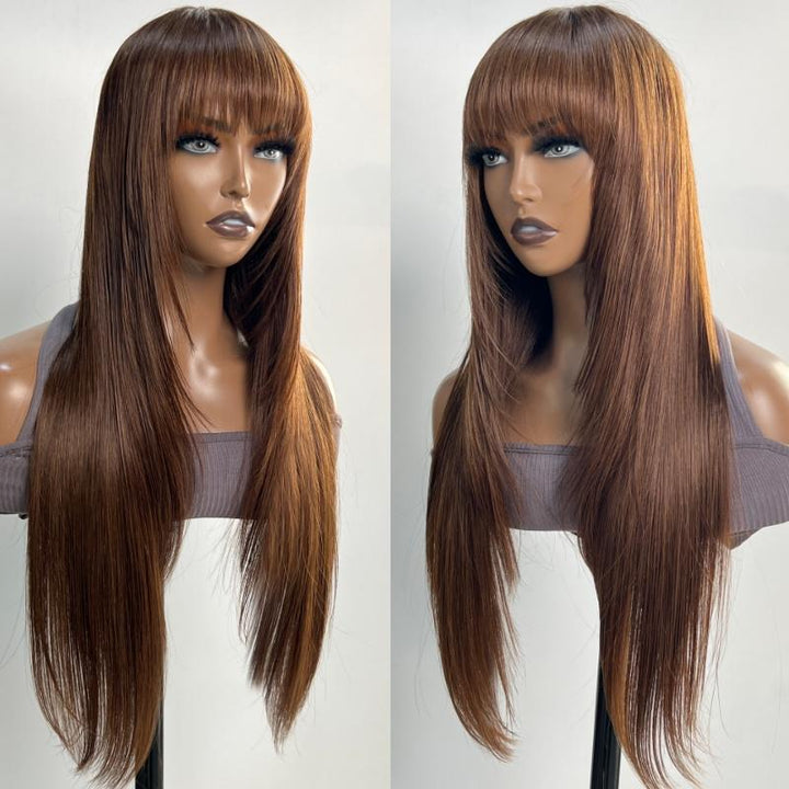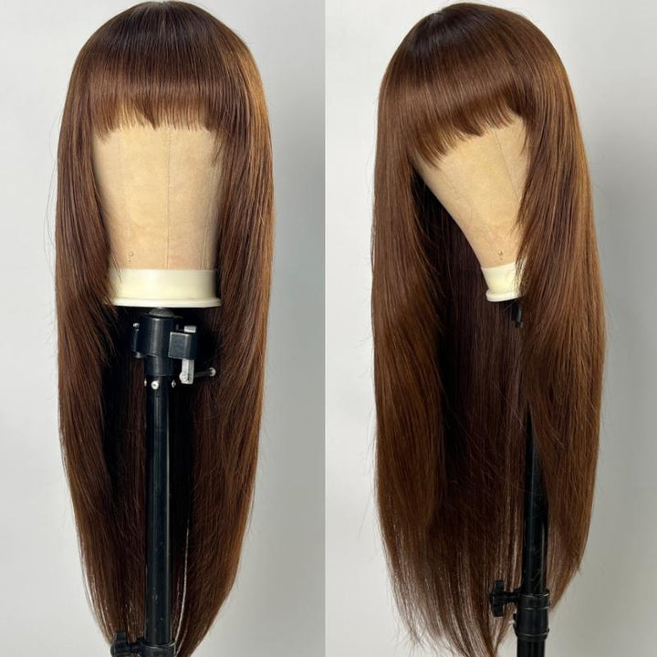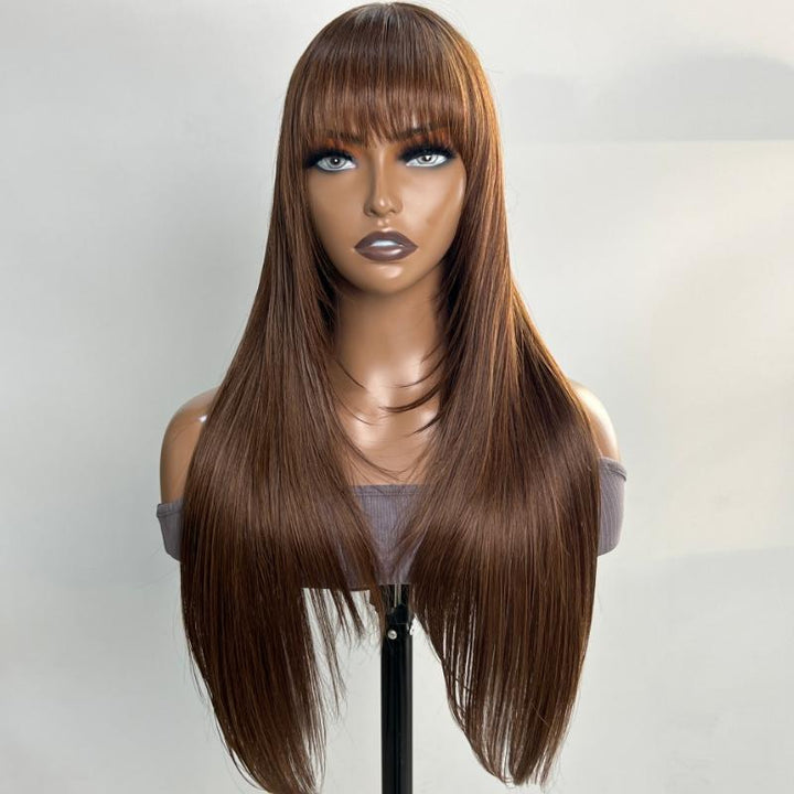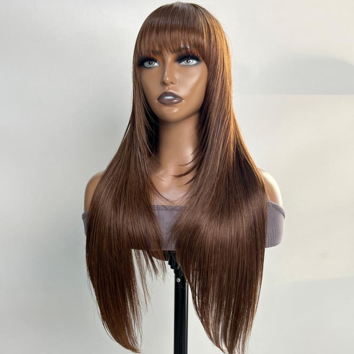 14 inches Layer Cut Mocha Medium Brown Glueless Beginner Friendly Straight Wig With Bangs