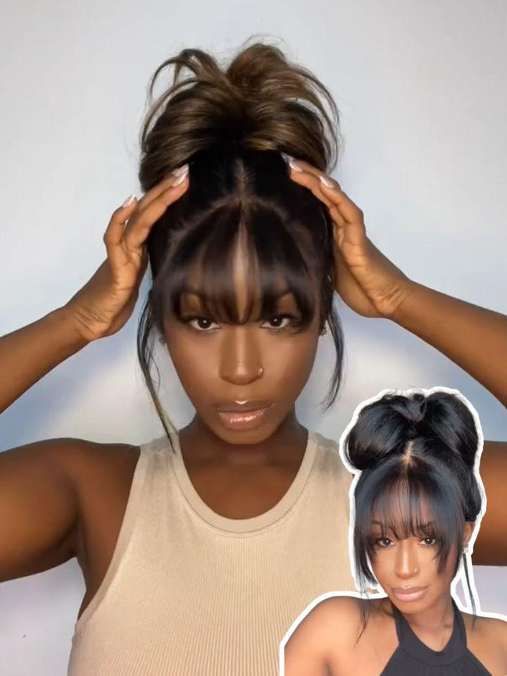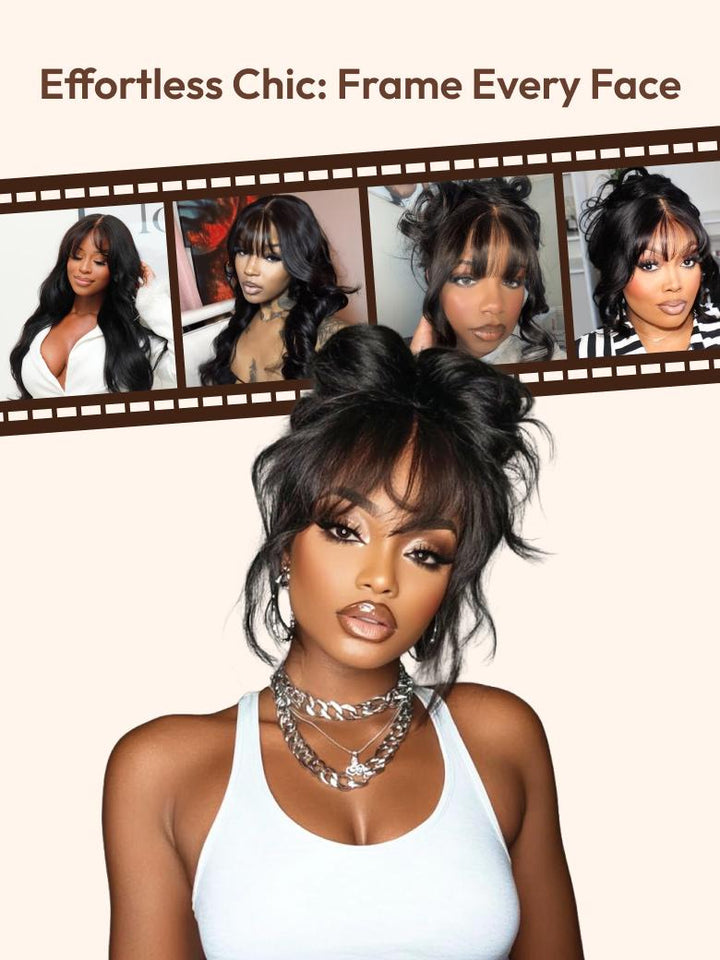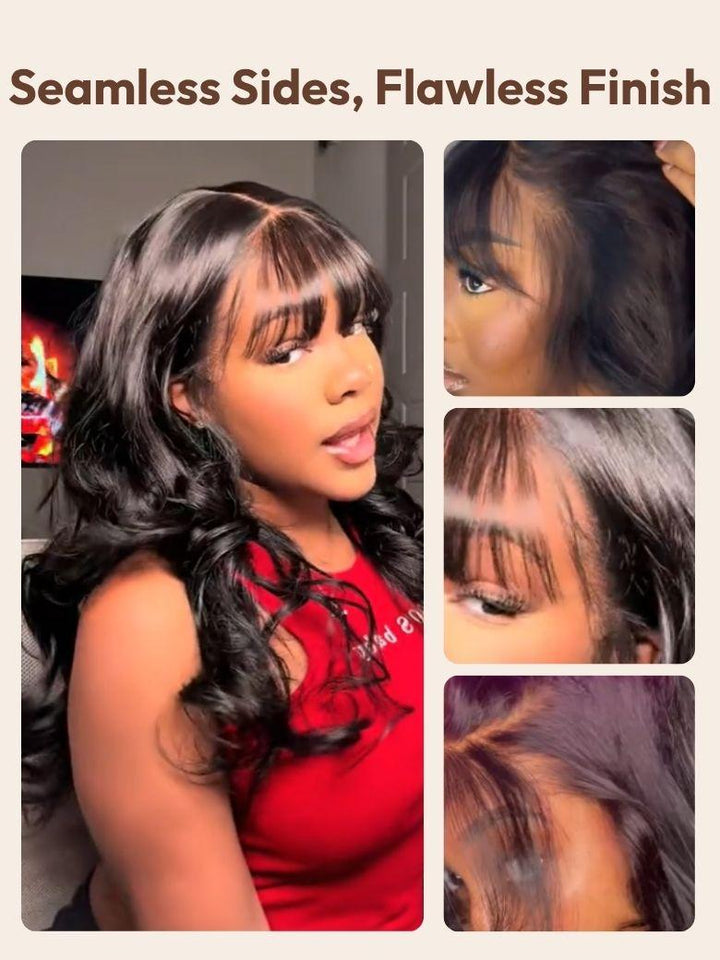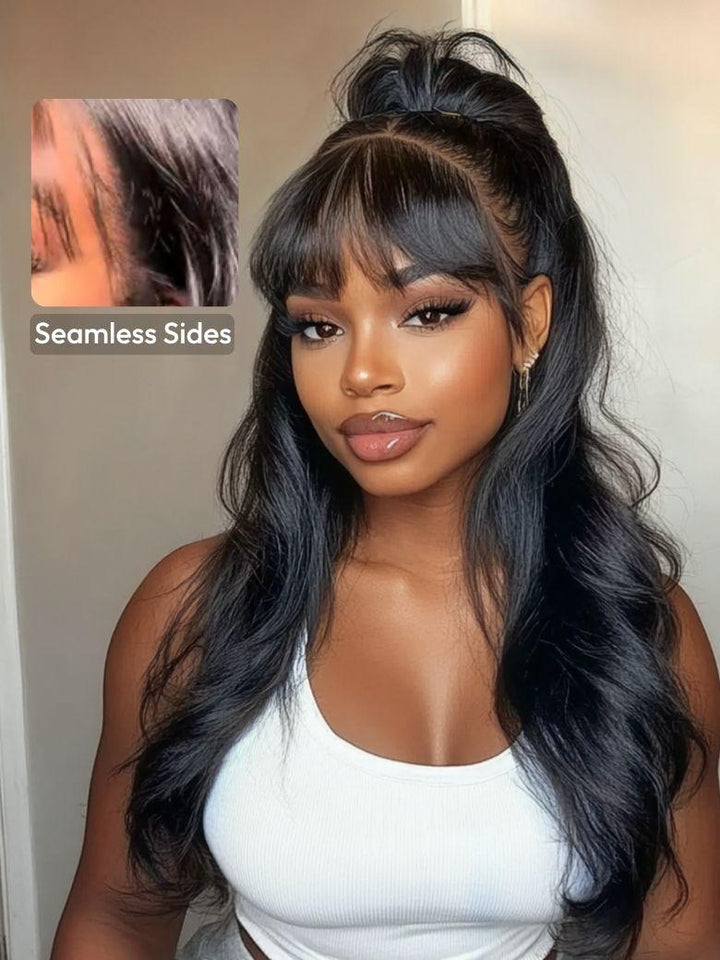 7x5 Bye-Bye Knots™ Lace Pull And Go Black Fluffy Natural Loose Wave Curtain Bangs Seamless Sides Wig With Invisi Drawstring 180% Density