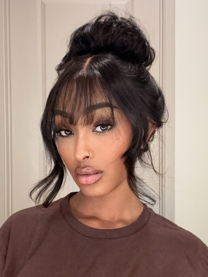 7x5 ByeBye Knots™ Black Fluffy Natural Loose Wave Curtain Bangs Wig