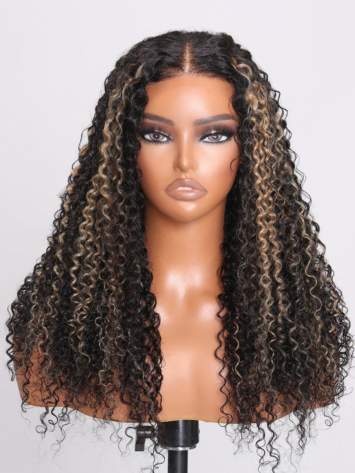 Bye Bye Knots Wig 7x5 Glueless Lace 180% Density Honey Brown Highlights Jerry Curly Wig With Bleached Knots