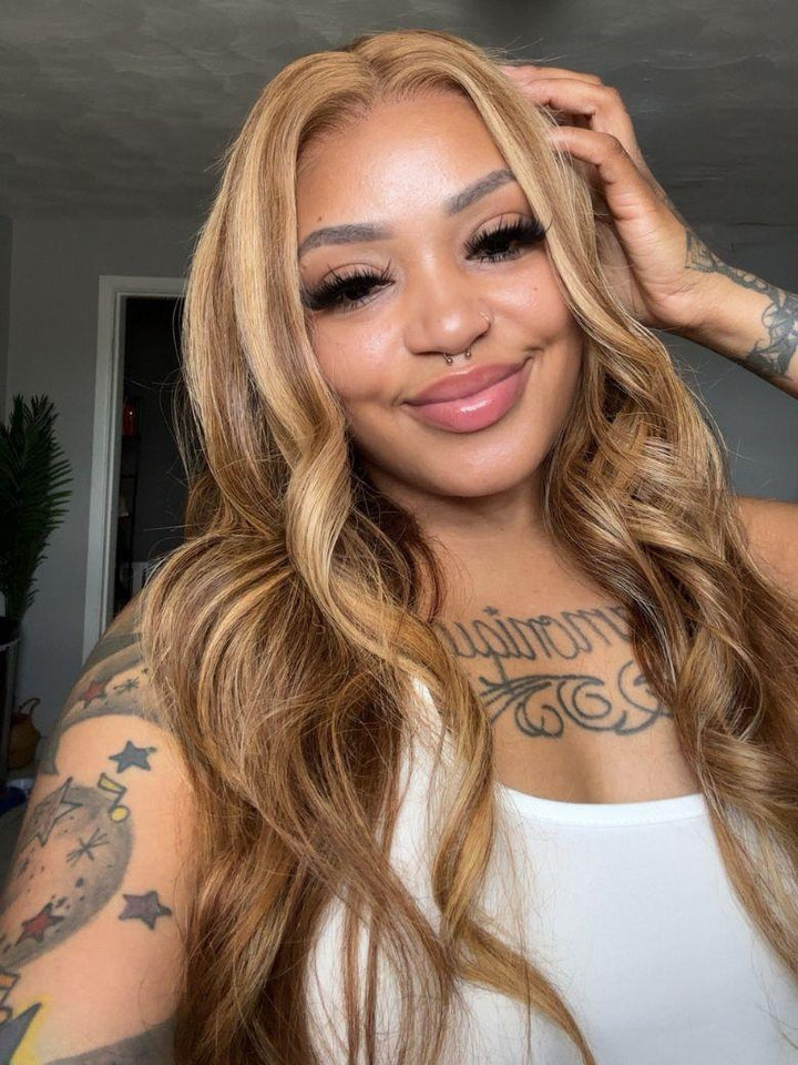 Byebye Knots 7x5 Glueless Lace Honey Blonde Body Wave Wig With Bleached Clean Knots 180% Density