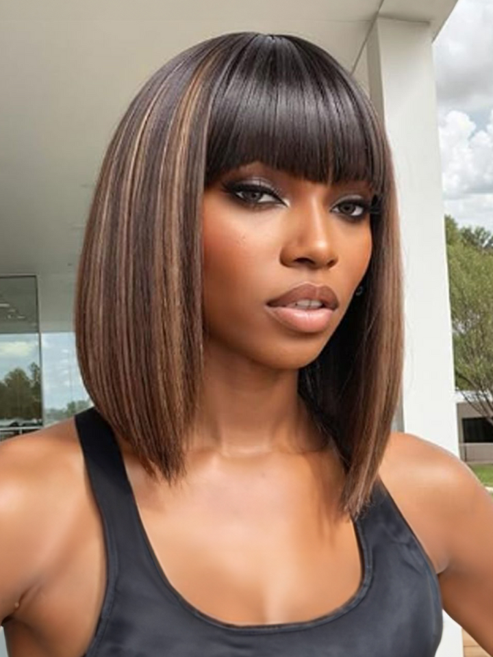 Middle Part 4x2 Glueless Lace Bob Wig Balayage Highlight Color Short Bob with Bangs 150% Density