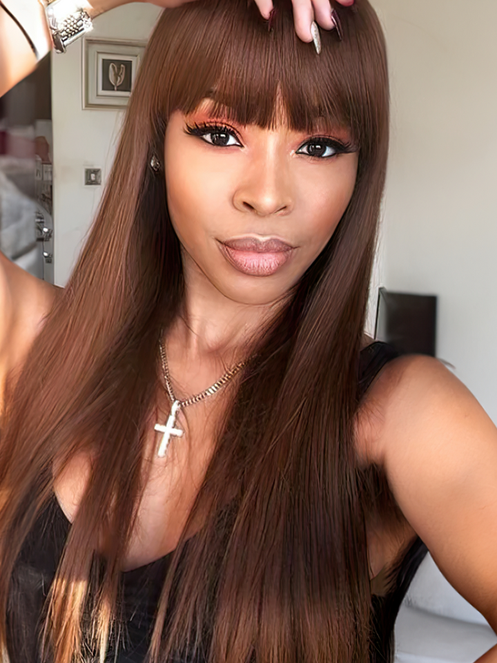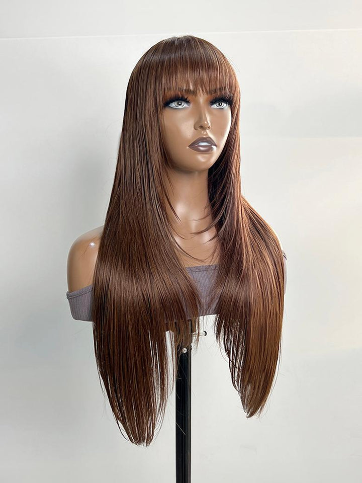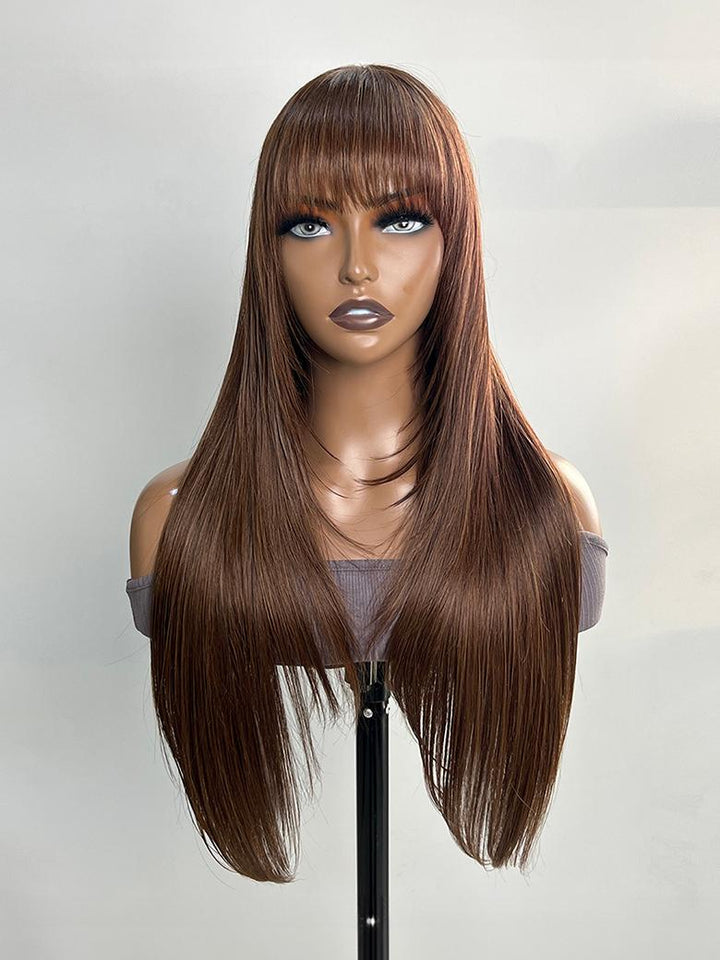 Mocha Medium Brown Layer Cut Glueless Beginner Friendly Straight Wig With Bangs