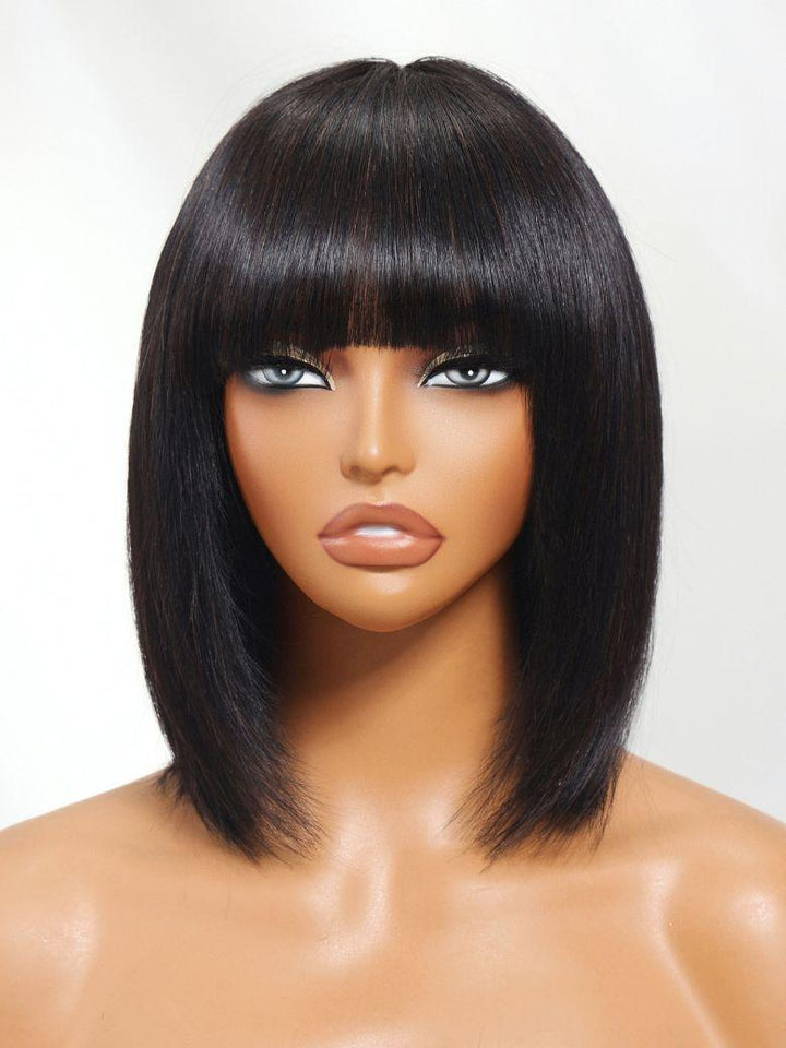 Straight Bob Black Wig 100% Human Hair Glueless Wig with Blunt Bangs