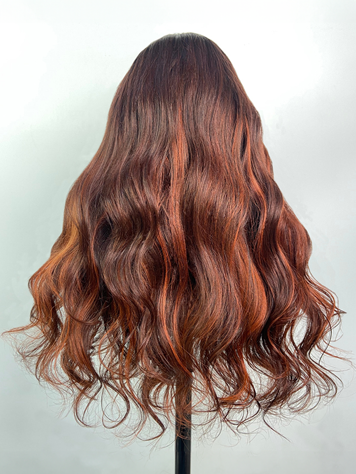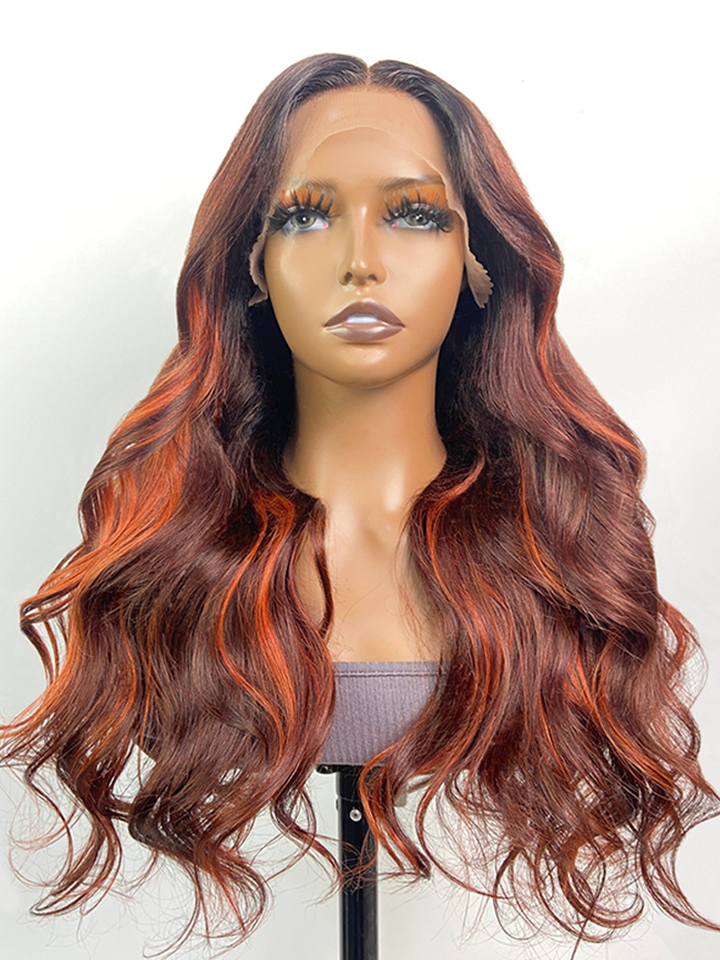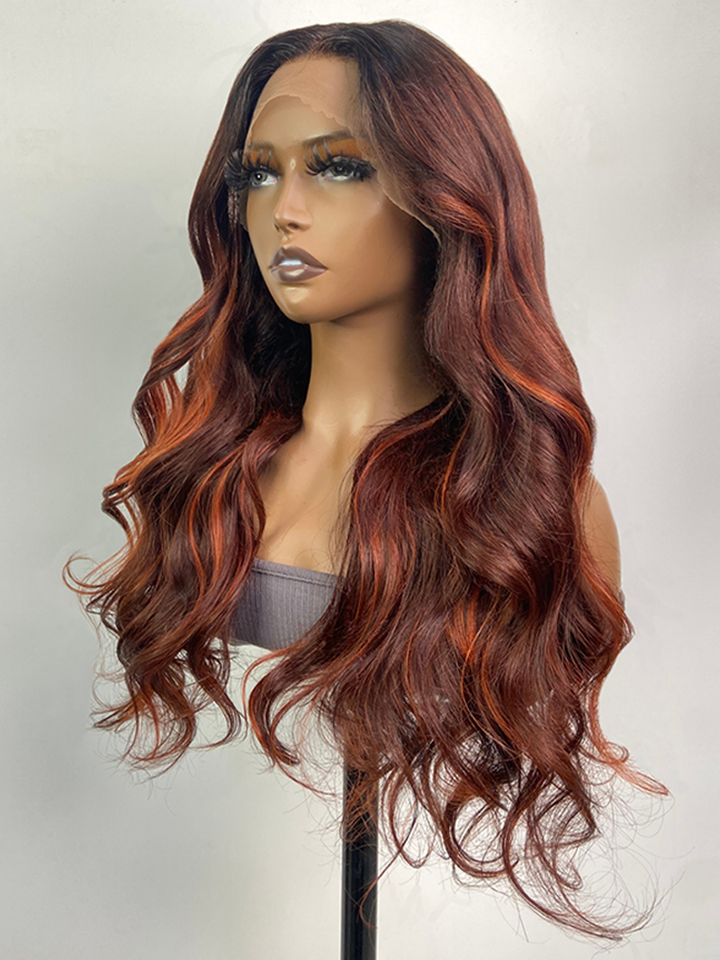 24 Inch 180% Density 13x4 Frontal Auburn Brown with Ginger Highlights Body Wave Wig