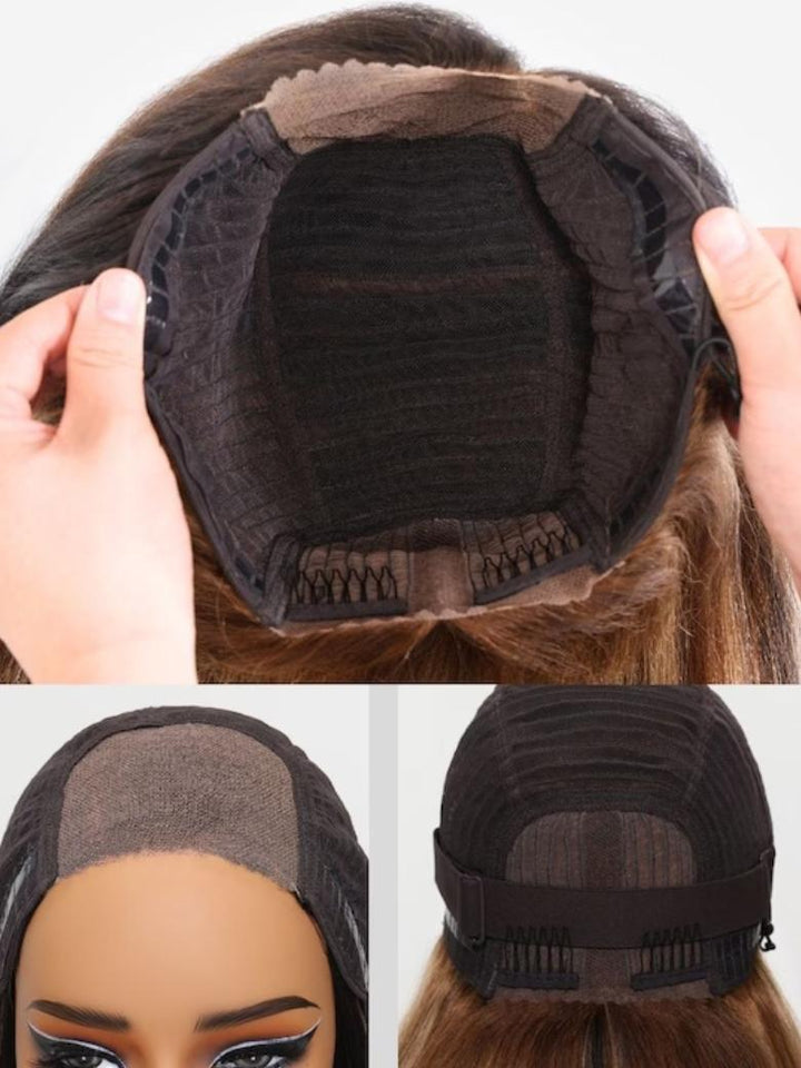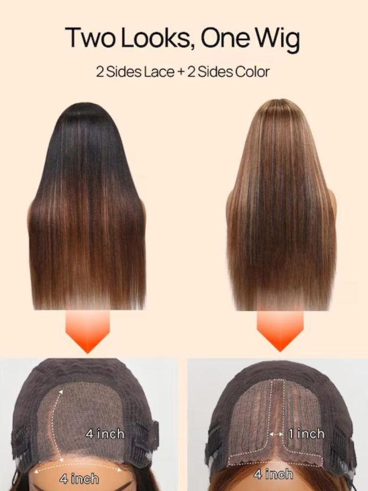 Double Wear 4x4 Yaki Straight Wig Ombre Chestnut Brown & Honey Blonde Higlight 2 Styles In 1 Put On And Go Wig