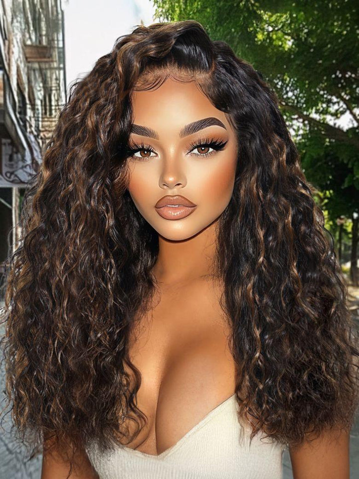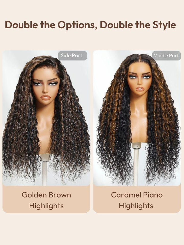 UNice Bye-Bye Knots 7x5 Lace Water Wave Black Wig With Golden Brown Highlights & Natural Black 150% Density Perfect Beach Look for Summer